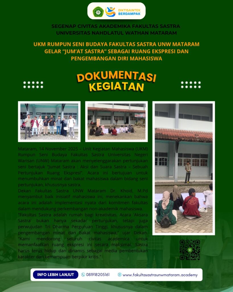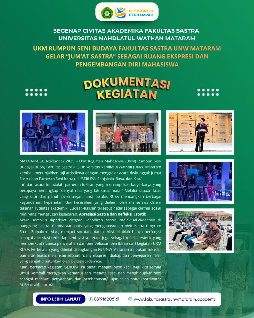 Dalam rangka memperkuat dan mengembangkan minat serta bakat mahasiswa dalam bidang sastra dan budaya, Fakultas Sastra Universitas Nahdlatul Wathan Mataram meluncurkan program unggulan Jum’at Aksara Sastra yang diselenggarakan oleh UKM Mahasiswa Fakultas Sastra. Kegiatan ini menjadi wadah inovatif yang dirancang Read more